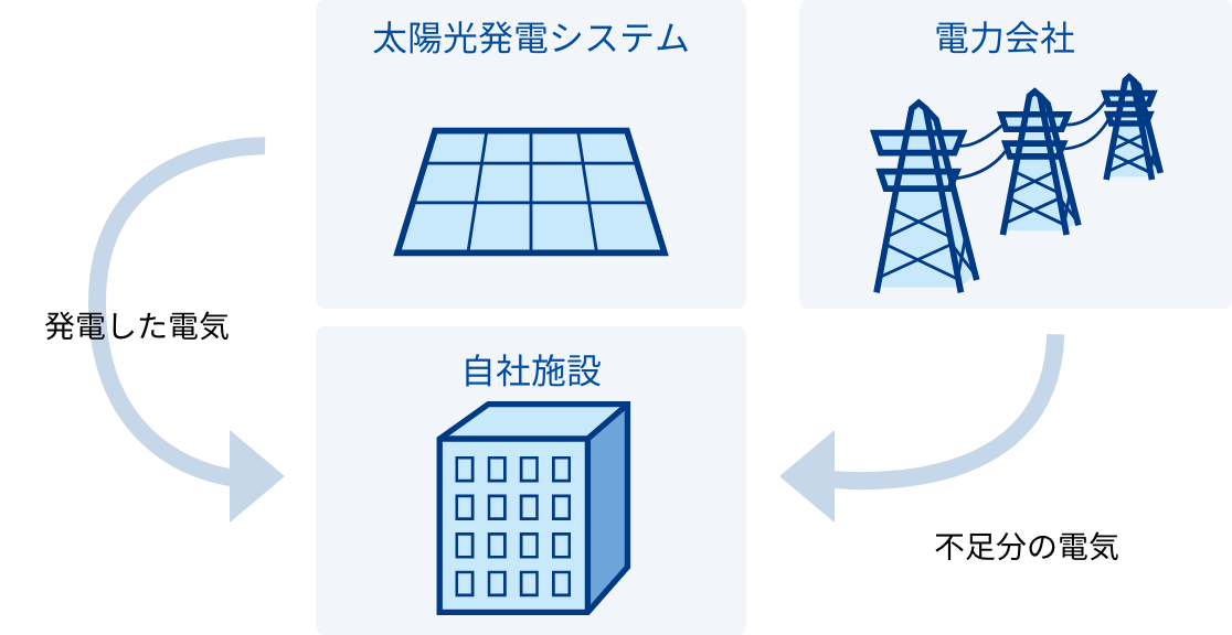 自社で発電した電気を売るのではなく、自社施設で使用するシステムのことを指します。自社で活用するため電気代の削減にもつながり、蓄電池を同時に導入することで災害時対策も可能です。