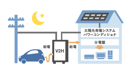 昼間は太陽光発電システムの発電電力を電気自動車に充電し、夜間帯は電気自動車の充電電力を家庭内に給電することができます。