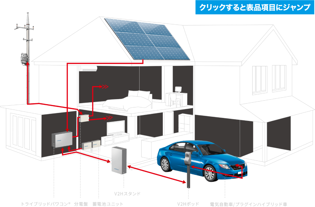 太陽電池、蓄電池、電気自動車の内蔵電池の3電池を統合制御。それぞれの充放電動作をDC接続のまま高効率に行えます。停電時にもエアコンやIHが使用可能な全負荷200V標準搭載です。